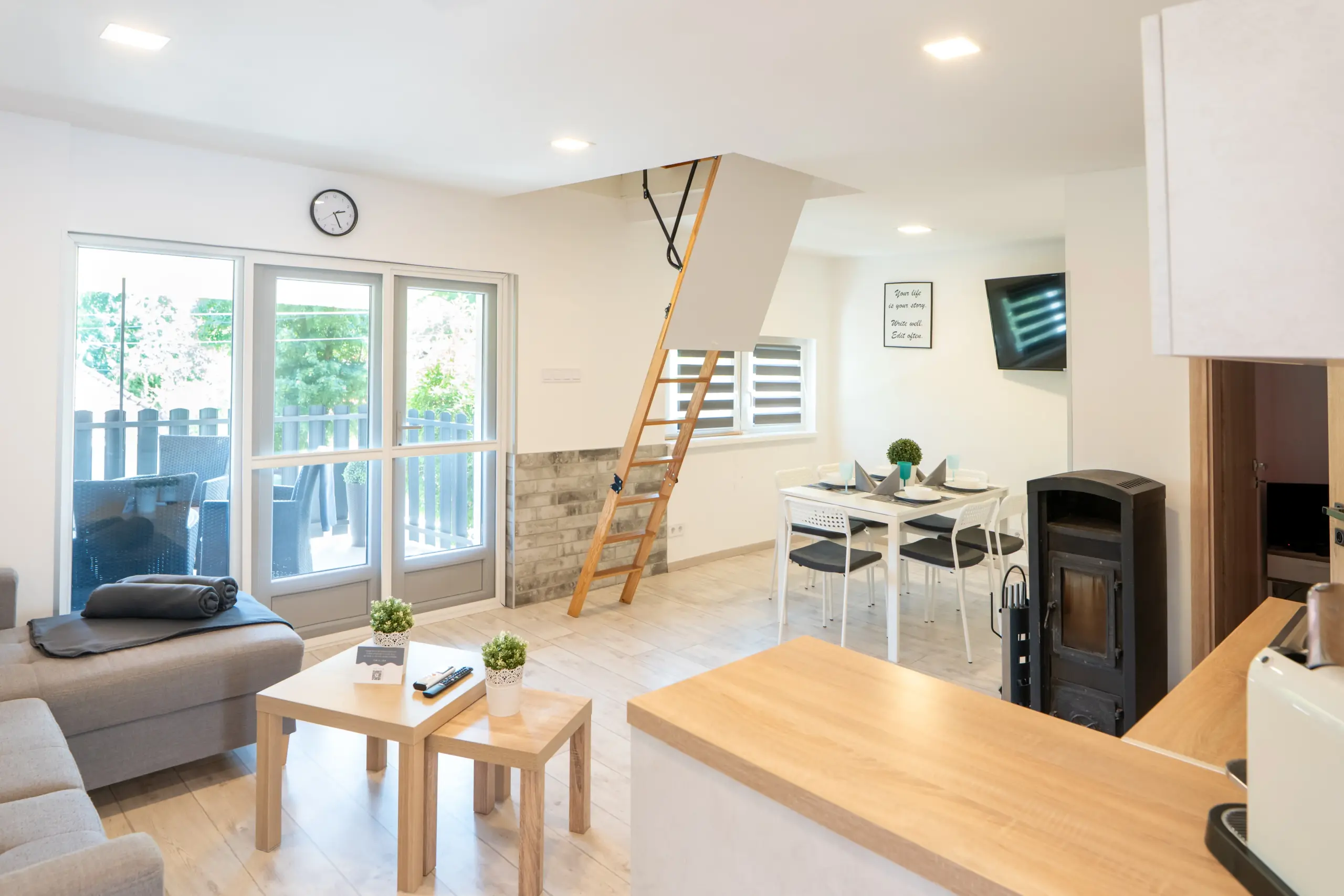 Az apartmanház minden részletében otthonos, barátságos és praktikus – ideális helyszín közös reggelikhez, nyári estékhez a teraszon, vagy egy aktív nap utáni pihenéshez az erdő nyugalmában.