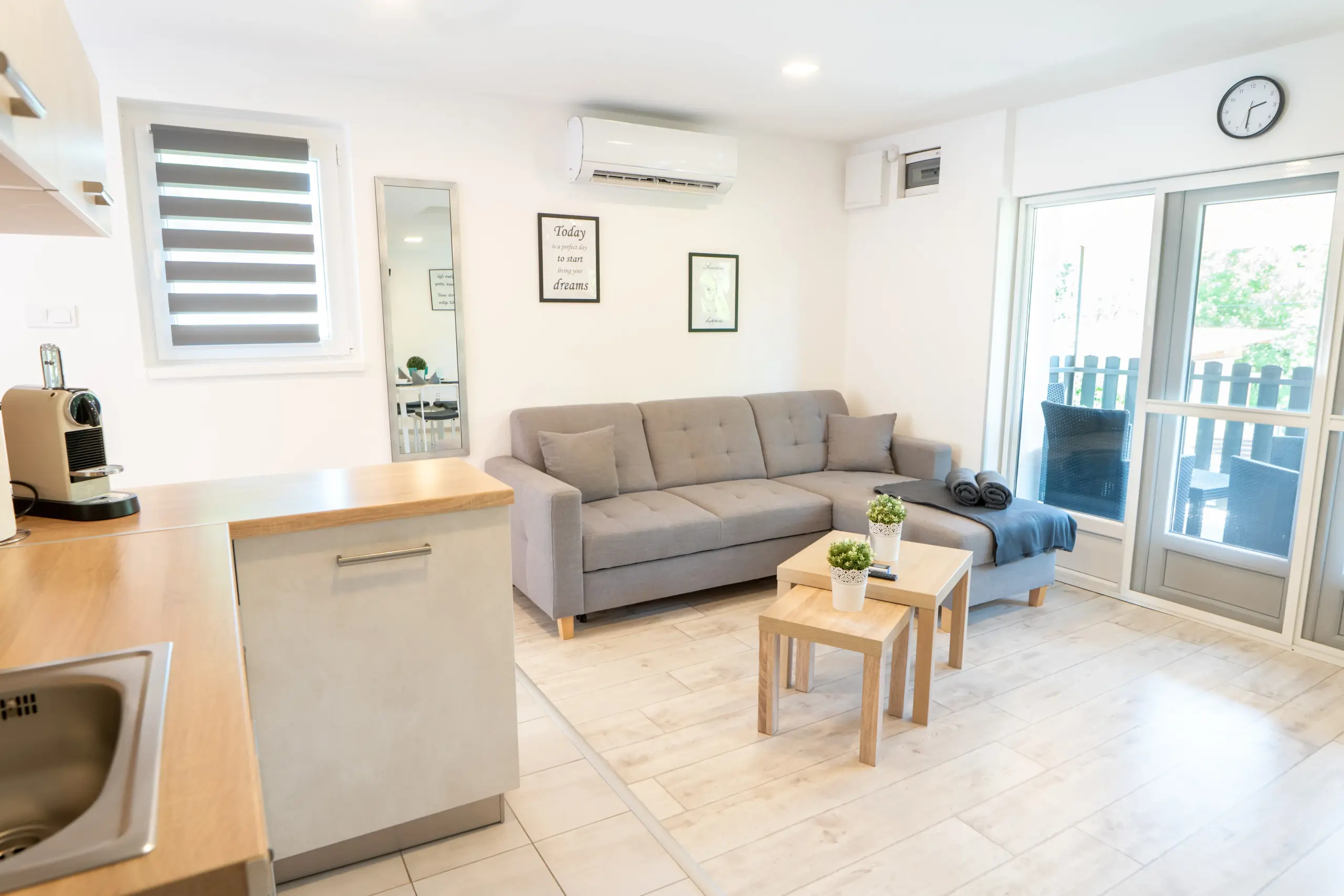 A tágas apartman három külön hálószobával rendelkezik, így akár nagyobb társaságok számára is kényelmes szállást biztosít. Elöl egy kisebb terasz, hátul pedig egy hatalmas privát udvar és terasz vár, ahol grillezési lehetőség teszi még hangulatosabbá az együtt töltött időt. Az udvaron saját parkolók is rendelkezésre állnak, így az autókkal érkező vendégeknek sem kell aggódniuk.